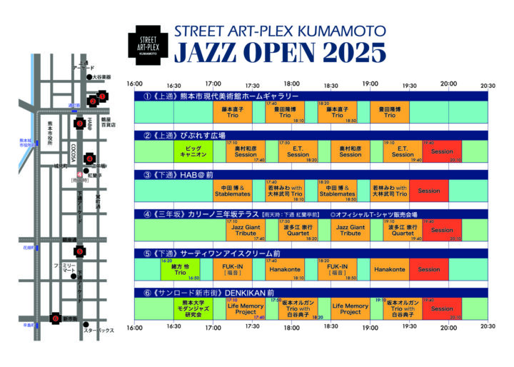 | 場所 | 1.上通 びぷれす広場 2.上通 熊本市現代美術館ホームギャラリー 3.下通 HAB@前 4.三年坂 カリーノ三年坂テラス(雨天時:下通 紅蘭亭前) 5.下通 サーティワンアイスクリーム前 6.サンロード新市街 DENKIKAN前 |